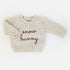 This hand-knit sweater features the words 'snow bunny' embroidered in Pecan brown on the front, adding a charming touch to your child's winter wardrobe. The Natural color and chunky yarn provide a cozy feel, while the raglan sleeves with cable knit detailing add a touch of sophistication. With its soft neckline, this sweater ensures easy dressing for your little one, making it a practical choice for busy mornings. Our sweaters are partially knit from recycled, sustainable Polyester yarn made from plastic bottles. We are on a mission to help reduce the world's plastic pollution problem ♻ • Hand Knit in China • 60% Acrylic, 40% Recycled Polyester • Hand Wash