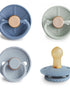 The FRIGG line of natural rubber pacifiers have been thoughtfully designed for your baby's comfort. The outward curve keeps the pacifier off their delicate skin, while features like air holes and a security handle ensure your baby stays safe. Available in a range of soft colors, FRIGG pacifiers make a beautiful addition to your collection of baby essentials.