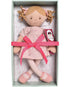 Amelia is a soft doll toy and is wearing a beautiful pink all-natural linen pink dress with matching shoes, stripy pink tights, and pink hair ribbons.