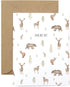 Celebrate and welcome the darling new baby boy in your life with this hand-illustrated, botanic-inspired card featuring soft and sweet bears, foxes, bunnies, deer and trees in handsome shades of tans. It’s a great choice to congratulate the new parents or parents-to-be! Card comes with a matching envelope.