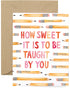 Let your child's teacher know how much you appreciate them with this sweet greeting card. It’s perfect for teacher appreciation, teacher Christmas gifts, end-of-the-school year gifts, back to school gift, or just because. This card features hand-illustrated pencils and the words "how sweet it is to be taught by you".